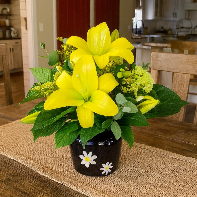 This arrangement of golden Lilies, Parrot Tulips and green Hydrangeas are a recipe for fresh, fabulous greetings! Turn any day into a special one with this happy surprise, arranged in a classic glass bowl.