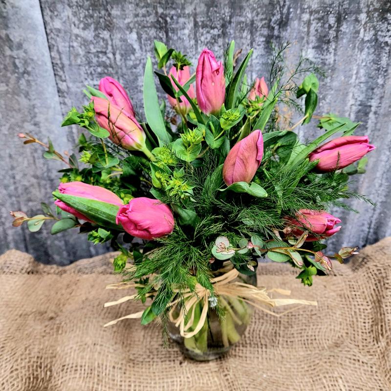 This gorgeous arrangement consists of 10 tulips arranged beautifully in a vase with filler and greenery. Promised to please the one receiving it.  Color may vary depending on availability.  Ranging from yellow, pink, white, purple, orange, red etc...