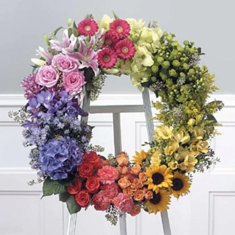 Like a beacon of love and hope, this glorious wreath of all the colors of the rainbow echoes the joy of your precious memories.