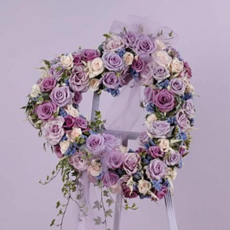 Take a walk through the garden of memories with this lush heart wreath of lavender and ivory blooms. It's a joyful expression of sympathy sure to be appreciated.