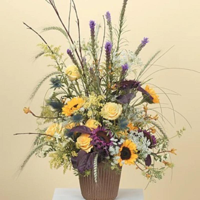 Send a message of warmth and hope with this magnificent display of sunflowers and roses, a colorful tribute that will warm their hearts.