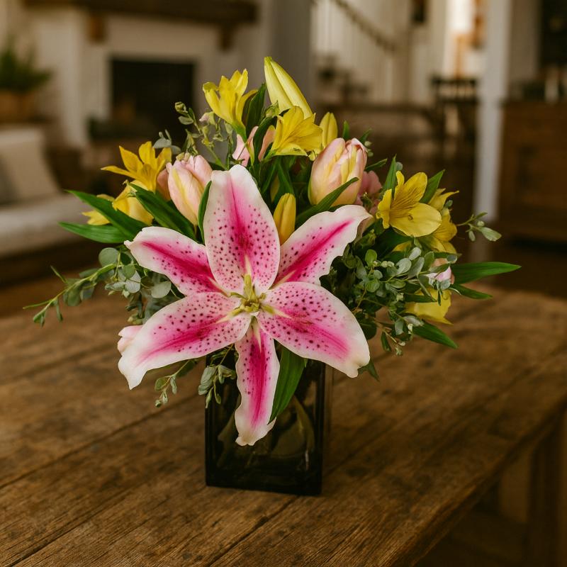 Stunning in its simplicity, this arrangement of Stargazer Lilies, Tulips and Alstromeria are a heartfelt way to send your very best. The classic, clear square glass vase keeps the focus on the beauty of the blooms.