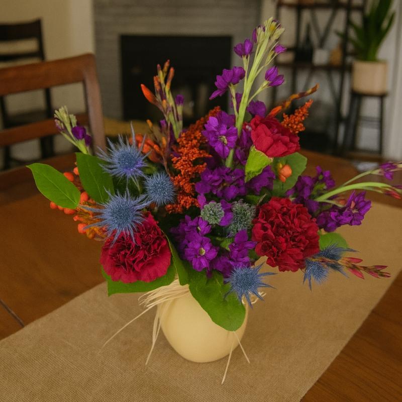 This eye-catching arrangement is full of bold color and texture, designed to make a statement in any space. Featuring rich burgandy carnations, striking purple stock, and unique blue thistles, it’s accented with touches of orange and lush greenery for a balanced, garden-fresh look. Arranged in a soft cream vase with natural raffia detailing, this bouquet brings both elegance and a touch of rustic charm. Perfect for gifting or brightening up your own home, it’s a stunning choice for anyone who loves vibrant, modern florals.