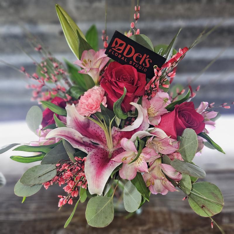 Take their breath away with this stylish cube vase arrangement. Including a beautiful pink lily with white and pink filler flowers.
