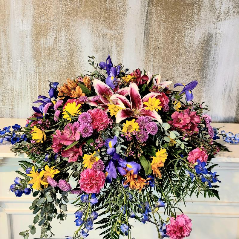A colorful reflection of a joyful life lived, this casket spray brings a rainbow of color to the service.