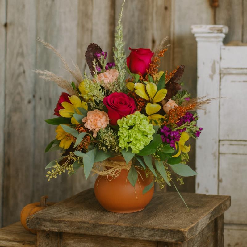 Bring the warmth of fall indoors with this stunning seasonal arrangement. Designed in a terra-cotta style vase, it features a vibrant mix of blooms including bold red roses, cheerful yellow alstroemeria, soft peach carnations, lush green hydrangea, and pops of purple accent flowers. Wisps of grasses and eucalyptus add the perfect rustic touch, creating a natural, farmhouse feel. Perfect for a cozy centerpiece, a thoughtful gift, or simply adding autumn charm to your home.